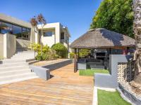 The home offers two open-plan living areas, one warmed by a wood-burning fireplace, the other by a gas fireplace, creating inviting spaces for year-round comfort. The main living area flows through sliding onto a covered entertainment patio with a built-in braai. From here, you overlook the beautiful swimming pool, outdoor braai area, thatched lapa, and the beautifully landscaped, low-maintenance garden.