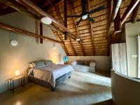 Step inside to discover an inviting open-plan living, dining, and kitchen area, characterized by a modern industrial aesthetic. High ceilings with exposed beams and polished concrete-look flooring create an airy, sophisticated atmosphere. A striking black spiral staircase serves as a unique architectural feature, while the contemporary kitchen island, complete with an integrated hob, forms the heart of this vibrant space. Air conditioning ensures year-round comfort.