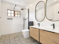 The North-facing master bedroom enjoys a modern en-suite bathroom with double vanities and a walk-in shower.