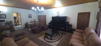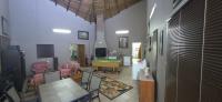 The open-plan design seamlessly connects the lounge and dining room, creating a spacious and inviting atmosphere. This area flows effortlessly into the open-plan braai room, which features a thatched roof, adding a touch of rustic charm.