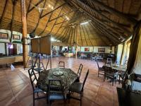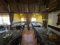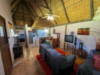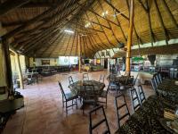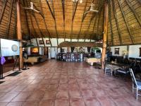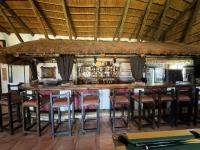 Thatched umbrella-covered restaurant area with a fully equipped bar, scanner system, and seating for 80 to 120 people.