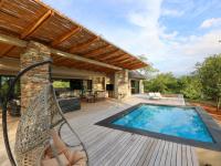 The true heart of this home lies in its expansive outdoor living areas. A vast wooden deck, private swimming pool, and covered patio provide multiple zones for relaxation and entertainment. Enjoy a built-in braai, a charming lapa, and a dedicated fire pit area, all set within a lush garden offering breathtaking scenic views. Sliding doors facilitate effortless indoor-outdoor flow, perfect for enjoying the wildlife estate environment.