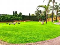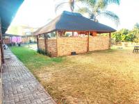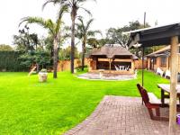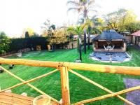 Outdoor living is a highlight featuring a large garden with mature trees, a covered swimming pool for leisure and a spacious patio perfect for relaxation. The property also includes a charming thatch roof Lapa providing an ideal setting for outdoor entertaining. An elevated wooden balcony offers additional outdoor space complementing the extensive yard which also features a fire pit area and a children's area with a swing set. Parking is abundant with four garages and ten additional open parking spaces ensuring ample room for vehicles.