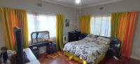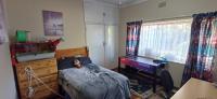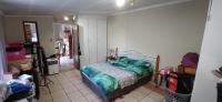 The bedroom is large with built-in cupboards and a tiled en-suite bathroom with a shower, washbasin, and a toilet.