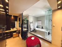1 Large Main Bedroom with en-suite Spa Bathroom equipped with hydrotherapy bath, Large Rain Shower doubles up as a Sauna/steam room and a walk in closet.