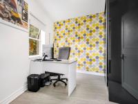The front opens into a spacious entrance way adjoining the open plan kitchen which is fitted with granite counters and a glass topped bar ideal for entertaining guests while cooking. The kitchen has real wood cabinets with glass insets, Bosch eye level oven, microwave and extractor, Ceran 5-plate electric stove, modern Meissen sink and space for two undercounter appliances and a single door fridge.