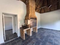 The inviting living room flows seamlessly into a spacious entertainment area complete with a built-in braai and sliding doors that open onto the patio and sparkling swimming pool — ideal for hosting family and friends.