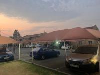 Step outside to a private patio, perfect for relaxation. The property benefits from two dedicated parking bays, with covered carports visible in the communal areas, providing protection for vehicles. Residents enjoy enhanced peace of mind with features like an access gate, security post, 24-hour security, and burglar bars, contributing to a safe living environment.