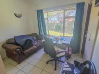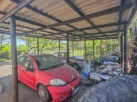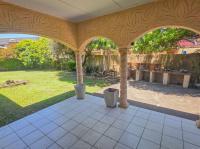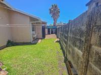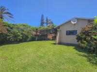 The kitchen includes a serving hatch and loose stove, flowing into a tiled lounge with a ceiling fan. The lounge opens onto a patio that sits alongside a large garden, offering ample space for outdoor living, entertaining, or simply enjoying the South Coast sunshine. Additional features include a built-in braai, laundry, and a carport with space for up to three vehicles.