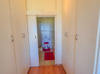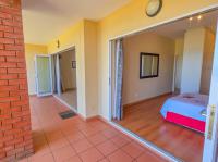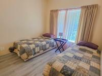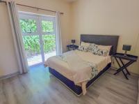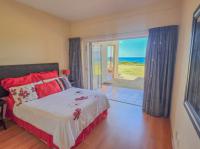 Down the hall, two bedrooms with laminated flooring and built in cupboards share a full bathroom. One bedroom opens onto a private outdoor area for added privacy. The main bedroom features laminated flooring, a private ensuite, and sliding doors leading onto the front patio with sea views.