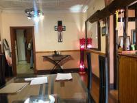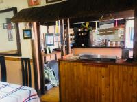 Inside, the home features two lounges and a dedicated dining room, providing versatile living areas with a bar area. The functional kitchen boasts extensive wooden cabinetry, an integrated oven/hob, and a pantry, offering practical storage. A distinctive thatched bar area with hardwood flooring adds unique character, ideal for entertaining.