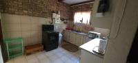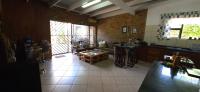 The kitchen is part of an open plan 2nd TV/entertainment room that is tiled, has solid wood built-in cupboards, and a door that opens to the swimming pool area and garden.