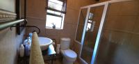 The bathroom has a shower, washbasin and a toilet.