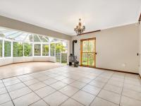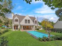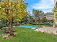 The living spaces extend onto a spacious covered patio overlooking a sparkling swimming pool and beautifully manicured, cottage-style gardens, complete with a paved outdoor seating area, perfect for entertaining.