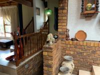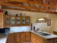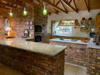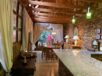 Step inside to discover an interior where rustic charm meets expansive living. The open-plan layout is a symphony of design, featuring prominent exposed brick walls and magnificent wooden beams that soar across high ceilings, creating an atmosphere of warmth and architectural interest. Abundant natural light streams through large windows, illuminating the two generous lounges, a dedicated dining room, and a well-appointed kitchen complete with a convenient pantry. A charming fireplace adds a touch of classic comfort, perfect for intimate gatherings.