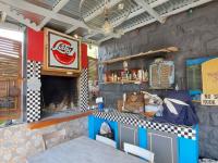Stepping outside from the scullery area, you'll discover a captivating outdoor entertainment area centered around a sparkling swimming pool. The area is adorned with retro-style patio furniture, including lounge chairs with colorful cushions and a vintage bar cart stocked with your preferred beverages. Whether you're hosting a poolside barbecue or enjoying a tranquil evening beneath the stars, this space is ideal for socializing and unwinding.