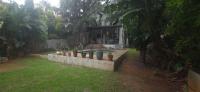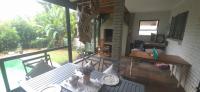 Outdoor Entertaining: A large patio with a built-in braai overlooks a sparkling pool, all set within a lush, green garden—ideal for gatherings and weekend enjoyment.