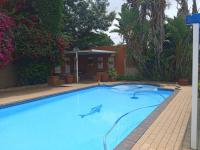 The outdoor space features a refreshing swimming pool within a private garden, complemented by a borehole for water resilience. Parking is generous with two garages and additional space for six vehicles. An added flatlet offers potential for extended family or rental income, alongside outside toilets. Security is enhanced with an access gate, electric fencing, and burglar bars. Pets are allowed, making this a versatile family home in a metropolitan and suburban setting.