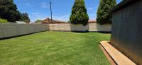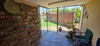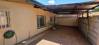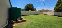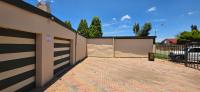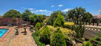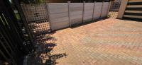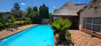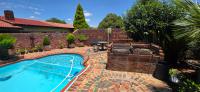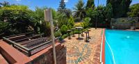 The area around the swimming pool is paved with a built-in braai and benches.