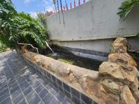 The exterior of the property is designed for outdoor enjoyment and relaxation. A private patio area complete with a built-in braai offers an ideal setting for al fresco dining. The lush garden provides a serene environment complemented by an established water feature adding character to the outdoor space. A swimming pool is also present offering recreational opportunities. Paved walkways and a covered parking area further enhance the property's functionality.