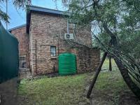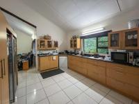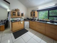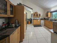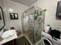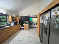 Inside, the home comprises three bedrooms and two bathrooms. The interior layout includes a lounge and two distinct kitchen areas, offering flexibility for various living arrangements. Key features include tiled flooring throughout, ensuring durability and ease of maintenance. The main living area benefits from ample natural light through a large window and boasts an open-plan design that flows into one of the kitchen spaces. Some utility areas showcase rustic exposed wooden ceiling beams and functional counter spaces, ready for a discerning buyer to modernise and customise to their taste. An air conditioning unit is present in living area, and gas geysers provides efficient water heating.
