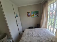 The home comprises three comfortable bedrooms, each with tiled flooring and built-in wardrobes for practical storage. The main bedroom includes a private en-suite bathroom, while a second well-appointed bathroom serves the remaining rooms. All windows are secured with burglar bars, enhancing peace of mind.