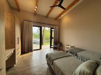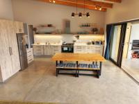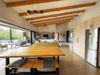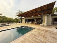 The home features three spacious en-suite bedrooms, all with exposed trusses, including a private master suite with outdoor shower. The open-plan living, dining and kitchen area flows effortlessly onto a covered patio, sun deck and pool, ideal for relaxed bushveld living and [hidden];
