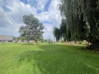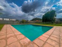 Residents of Crinklewood Complex enjoy access to exceptional communal facilities. A clean, inviting swimming pool with clear water is surrounded by terracotta-colored paving and a green lawn, perfect for leisurely afternoons. The expansive communal green spaces, shaded by mature trees including a prominent weeping willow, offer ideal settings for outdoor activities and relaxation. For social gatherings, a dedicated outdoor entertainment area features two concrete braai stations and a stone table with benches, fostering a sense of community. The complex also provides two dedicated parking bays for convenience.