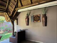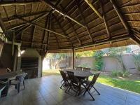 Step inside to an inviting open-plan living space where elegant light gray walls and durable tiled flooring create a serene ambiance. The focal point of the lounge is a cozy wood-burning stove promising warmth and character during winter evenings. An archway gracefully connects this area to an entertainment zone boasting a built-in wooden bar – perfect for hosting intimate gatherings. Two Large sliding glass doors invite natural light and provide seamless access to the Lapa area enhancing the home's flow. The residence further benefits from a distinct kitchen and scullery each offering ample cabinetry and functional layouts, alongside two dedicated dining areas providing versatile options for culinary pursuits and formal entertaining.