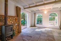 Adjoining the kitchen is a light-filled entertainment room with sliding doors and its own fireplace, opening directly onto the pool and garden.