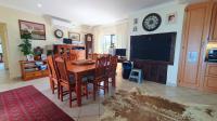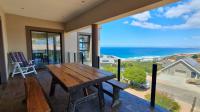 An open-plan, air-conditioned dining area connects seamlessly to two outdoor entertainment spaces: a sea-facing balcony and a wooden deck with staircase access to the landscaped rear garden.