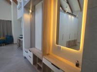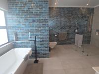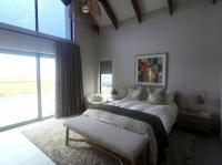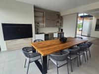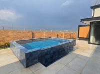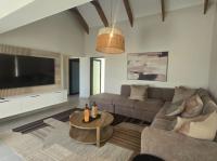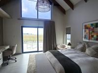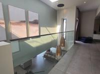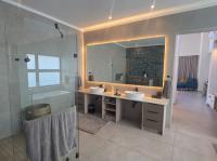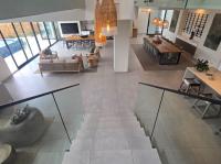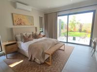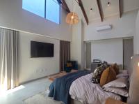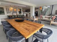 Inside, a spacious open-plan layout is designed for seamless living and entertaining. High vaulted ceilings with exposed wooden beams create an airy atmosphere, while large glass doors invite abundant natural light. The contemporary kitchen is a chef's delight, featuring a large island with seating, integrated appliances, and dedicated wine storage. Downstairs the dedicated dining room flows effortlessly to the TV lounge, enhanced by a sleek glass-paneled staircase and a contemporary fireplace. The entertainment area forms part of the open plan living space and includes space for a dining table and chairs, and a lounge suite. Also included in the entertainment area is a built in braai, built in cupboards, with a prep bowl. Five generously sized bedrooms, each with its own en-suite bathroom, ensure ultimate comfort and privacy. A dedicated study and staff quarters add practical convenience.