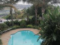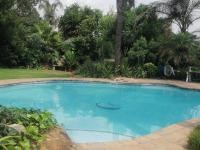 Outdoor living is a key feature with a inviting swimming pool adorned with a dolphin mosaic set within the beautifully landscaped garden. A patio and built-in braai area provide ideal spaces for outdoor entertaining. The property also boasts three garages and two additional parking spaces along with staff accommodation offering practical amenities.