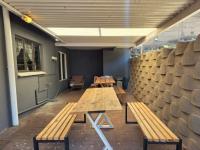 Step inside to discover a thoughtfully designed interior featuring durable tiled flooring throughout, ensuring easy maintenance. The home offers two comfortable lounges and a dedicated dining room, providing ample space for relaxation and entertaining. Natural light floods the living areas, complemented by wooden French doors and sliding glass doors that create a seamless flow between rooms. Exposed brick accent walls add character, while a wall-mounted TV in one lounge optimizes space.