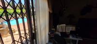 Entertainment room with tiled floors, curtain rails, ceiling fan, and security door leading to the swimming pool