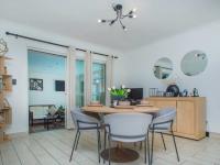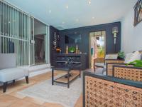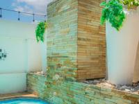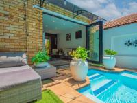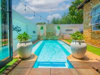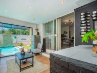 The dining room flows effortlessly into an enclosed entertainment area, providing a seamless transition to the outdoors. From here, you can enjoy views of the neat garden and splash pool, creating a serene backdrop for relaxation and hosting guests.