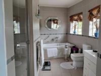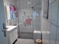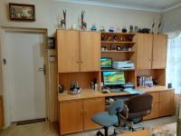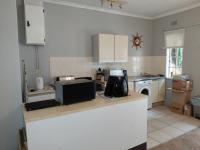 The compact, modern kitchen features granite countertops, a gas hob, and ample cupboard space, with a separate scullery providing additional utility space. A fully fitted study is conveniently positioned just off the entrance hall- ideal as a work from home space. Both the lounge and pub open through sliding doors onto a covered patio, overlooking the established garden, solar-heated swimming pool, and entertainment lapas.