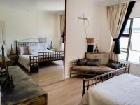 The luxurious main bedroom is light-filled and features a striking accent wall, tiled flooring, and a walk-in dressing room with mirrored doors. The en-suite bathroom is thoughtfully designed with a basin, jacuzzi bath, and toilet, creating a private sanctuary.
