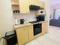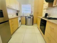 The modern kitchen is a highlight, boasting extensive light wood-grain cabinetry, dark countertops, and integrated appliances including a built-in oven, gas hob, and space for a washing machine and dishwasher. Natural light floods the space, creating an inviting atmosphere.
