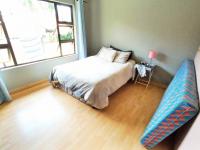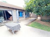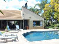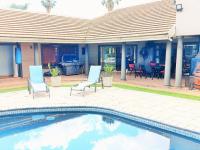 home elegantly wraps around a central pool area, complete with a large covered patio, built-in braai, and bar. Offering modern amenities alongside a two-bedroom