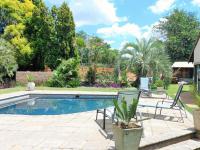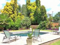 year-round hosting. The sparkling pool is neatly paved and framed by a vibrant green lawn and a backdrop of mature trees and shrubs.