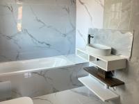 The home comprises three comfortable bedrooms, each featuring tiled flooring and neutral wall colours. There are two bathrooms, including a modern en-suite. The main bathroom is a highlight, featuring contemporary white and grey marble-look tiling, a floating vanity with a vessel sink, a bathtub, and a walk-in shower area, providing a clean and bright space.