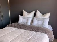 This suburban residence in Amandasig presents a modern aesthetic with its freshly painted two-tone grey exterior and well-maintained tiled roof. A paved driveway leads to a double garage, offering ample parking. Security is enhanced by visible security bars on windows and a front fence, providing peace of mind.