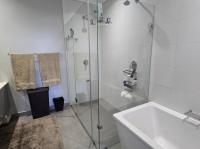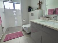 The heart of this home is its expansive open-plan living area, seamlessly connecting the lounge, dining space, and a state-of-the-art kitchen. The kitchen is modern and features a large central island with integrated gas hob and stove top. Abundant natural light floods the space through large sliding glass doors, enhancing the contemporary aesthetic and creating an inviting atmosphere for both daily living and entertaining.