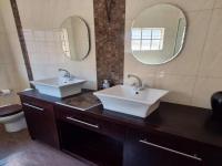 The outdoor area is equally impressive, set on a generous 775 sqm erf. It boasts a refreshing swimming pool, perfect for enjoying South Africa's sunny climate, complemented by a well-maintained garden and practical paving. Parking is abundant with two garages and an additional eight open parking spaces, catering to multiple vehicles or guests. Pets are welcome, making this a true family-friendly environment.