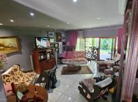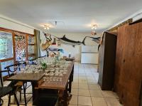 The property is set on an expansive 8 921 m² stand, surrounded by beautiful, established gardens with mature trees, fruit trees, vegetable patches, and abundant plant life Entering the home through the farmhouse-style kitchen, you are immediately welcomed by the scale and character of this spacious property. The kitchen truly is the heart of the home, offering ample cupboard space, a pantry, granite countertops, a prepping basin, two under-counter ovens, a glass hob, and a generous breakfast nook that comfortably seats at least eight people. There are fittings for both a washing machine and dishwasher, and garages provide direct access into the kitchen for added convenience. The kitchen flows effortlessly into the large dining room, from where stairs lead up to a versatile loft area ideal for storage, an office, or an additional [hidden];