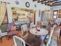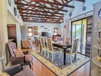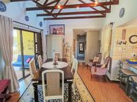 The lounge, dining area, and modern kitchen flow seamlessly together beneath high ceilings with exposed wooden beams, enhancing the sense of space and warmth. The kitchen features granite countertops, a gas stove, and a functional island, with sliding doors leading to a covered patio that extends the living area outdoors.