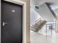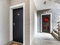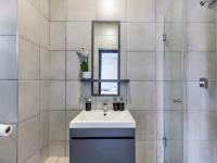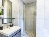The apartment features one well-sized bedroom and a modern bathroom, complete with a glass-enclosed shower, floating vanity with integrated basin, and stylish finishes in neutral grey tones. Additional storage is provided by a tall built-in cabinet.