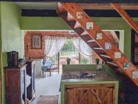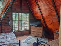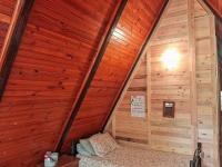 The main bedroom is situated downstairs with 4 more badrooms upstairs on the loft. The bedroom areas are separated with wooden walls providing privacy. The full bathroom is designed for convenience. Unique interior finishes, such as decorative tiled walls with mosaic borders and rustic wooden slatted walls, add individual flair to the sleeping quarters, with one bedroom benefiting from both air conditioning and a ceiling fan for optimal comfort. There are 2 air conditioners in the house.