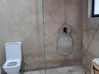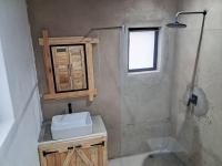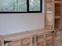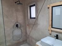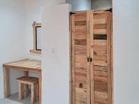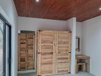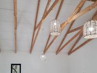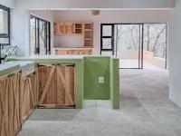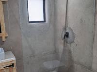 Step inside to discover an open-plan layout defined by high vaulted ceilings and exposed wooden trusses, creating an airy and spacious ambiance. Freshly painted white walls provide a clean canvas, ready for your personal styling. The living areas are bathed in natural light, flowing seamlessly to the outdoors. The kitchen features a distinctive light green bar with a concrete-look top and includes wooden stools, alongside custom-built raw wood cabinetry. Included in the price is the cemcrete finishes of the floors and bathroom walls.